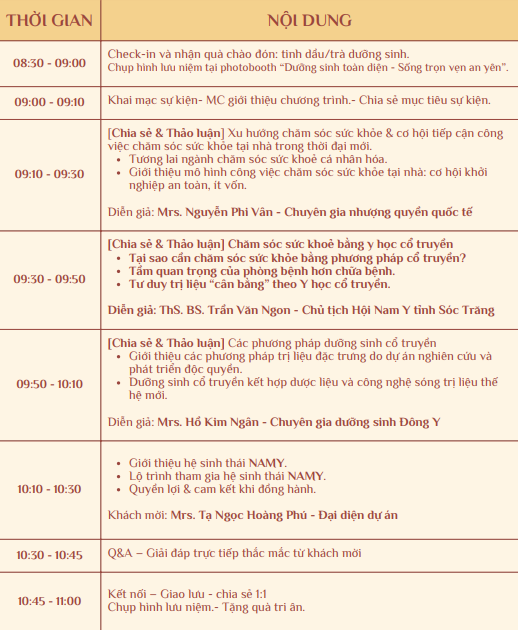 "Kết nối tinh hoa Y học cổ truyền & Cơ hội tiếp cận phương pháp chăm sóc sức khỏe tại nhà trong thời đại mới" Sự kiện nhằm lan toả sứ mệnh “Chăm sóc sức khỏe chủ động - Xây dựng sự nghiệp bền vững”, Đội ngũ NAMY Dự án Dưỡng sinh cổ truyền trân trọng kính mời Quý đối tác tham dự sự kiện: